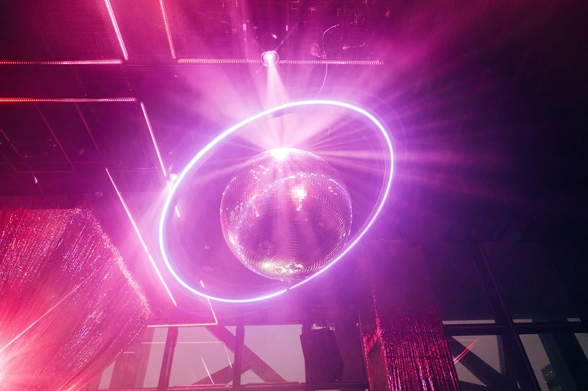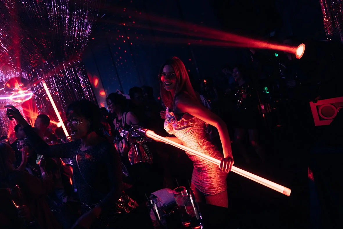 The experience manifested itself as a space cruise for future intergalactic voyagers. The Pier 1929 was transformed for the journey, with its interior shimmering from head to toe. Guests were welcomed by The Galactic Gate, a glitter wall with a neon sign where they could capture their attire. The main space, The Stairway to Heaven, had tables surrounding a central dancefloor. Two giant disco balls were suspended in mid-air, with neon rings for a planetary effect. Pink sequined streamers draped the four pillars of the large venue, providing a retro-disco aura. Guests rocked up in consumes that were fit for the stars, embodying the theme with sequence, space suits and shining body paint. The Planet Sushi Counter served lobster rolls, sushi and other Japanese delicacies to fuel the odyssey. Luminous accessories were also available to gear guests up for space exploration.
