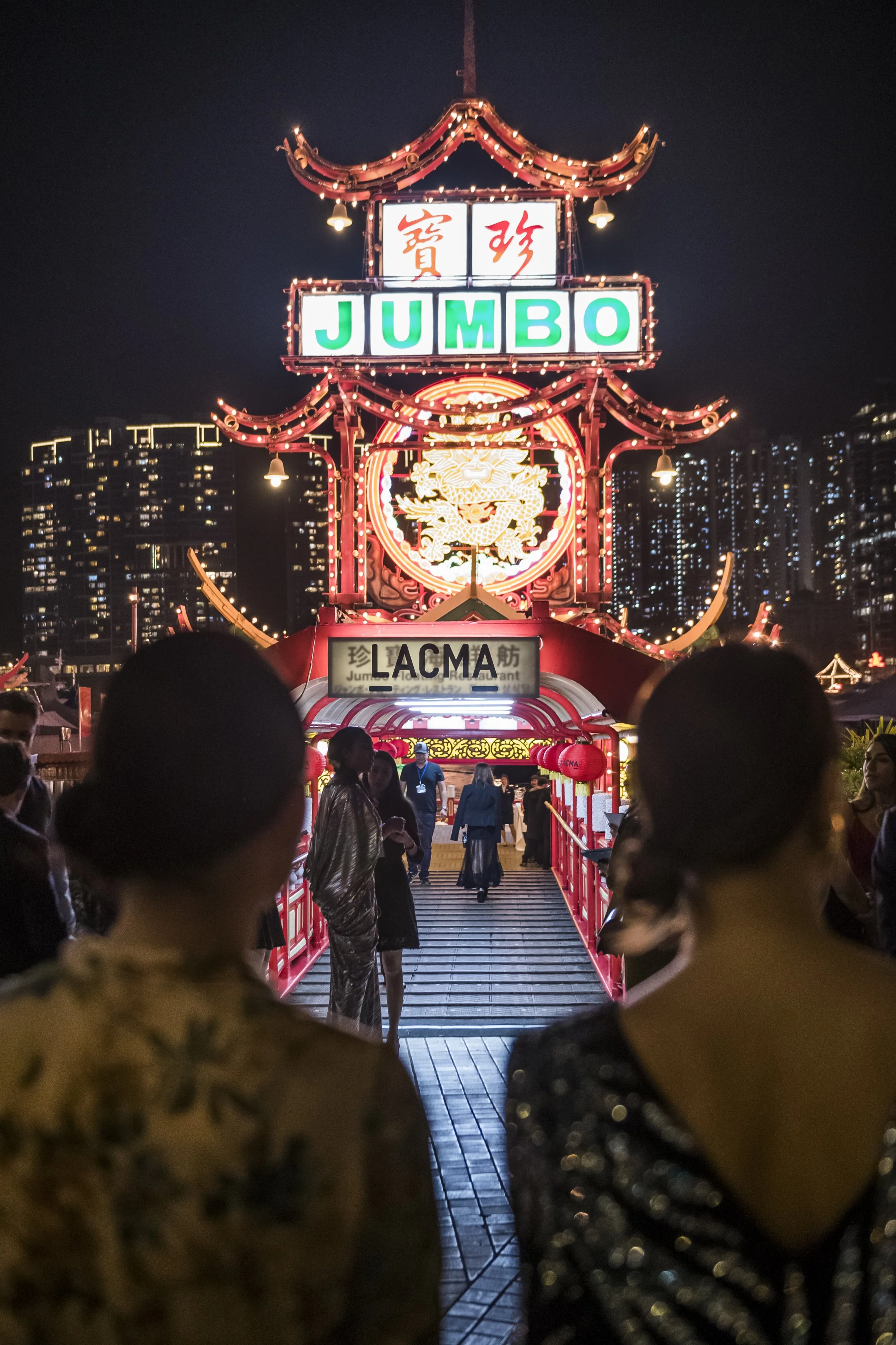 Described as one of Hong Kong's most exclusive parties, In the Mood for LACMA received high-profile press from global publications. With a narrative experience at the core, an elaborate production of performances and installations was carefully curated for A-list attendees. The experience was designed around the story of Scarlett Li, "the most legendary madam of the West Coast, and her disappearance after throwing her biggest soirée to date." From the very beginning of the experience, where guests boarded a traditional sampan to access the Jumbo Floating Restaurant, the plot started to unfold. Deep red dominated the scene, with a wall of roses and satin hands reaching out to welcome guests. In the banquet hall, performers were dotted amongst the crowd and on a pedestal was a smoke-filled boxed confining Scarlet Li. Live performances by the New York brass band Lucky Chops and DJ performances by Bas Bellini and Izy were accompanied by burlesque-style dancers. Setting a new standard for Hong Kong Art Basel parties, In the Mood for LACMA sailed 800 attendees through a unique and flamboyant experience.