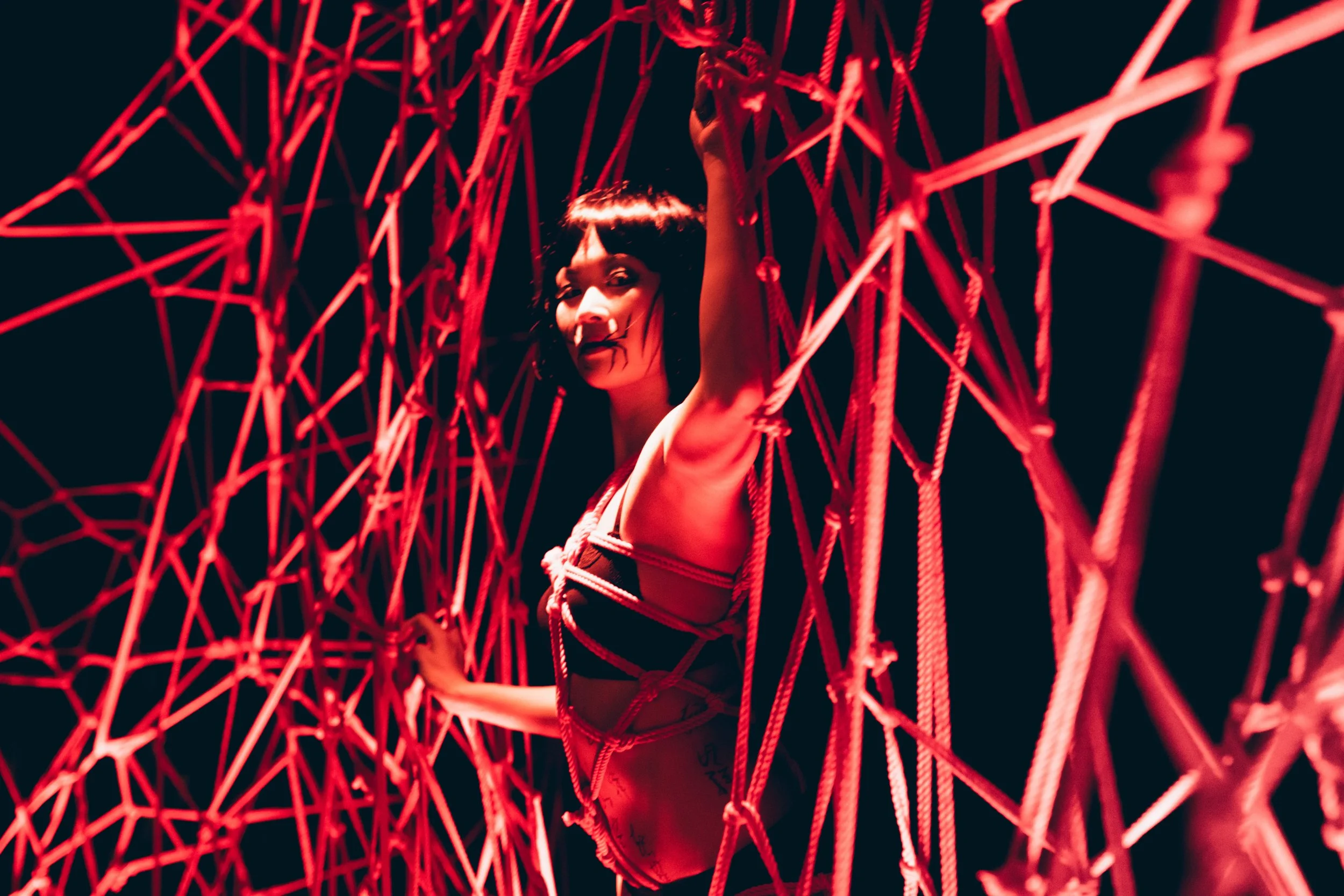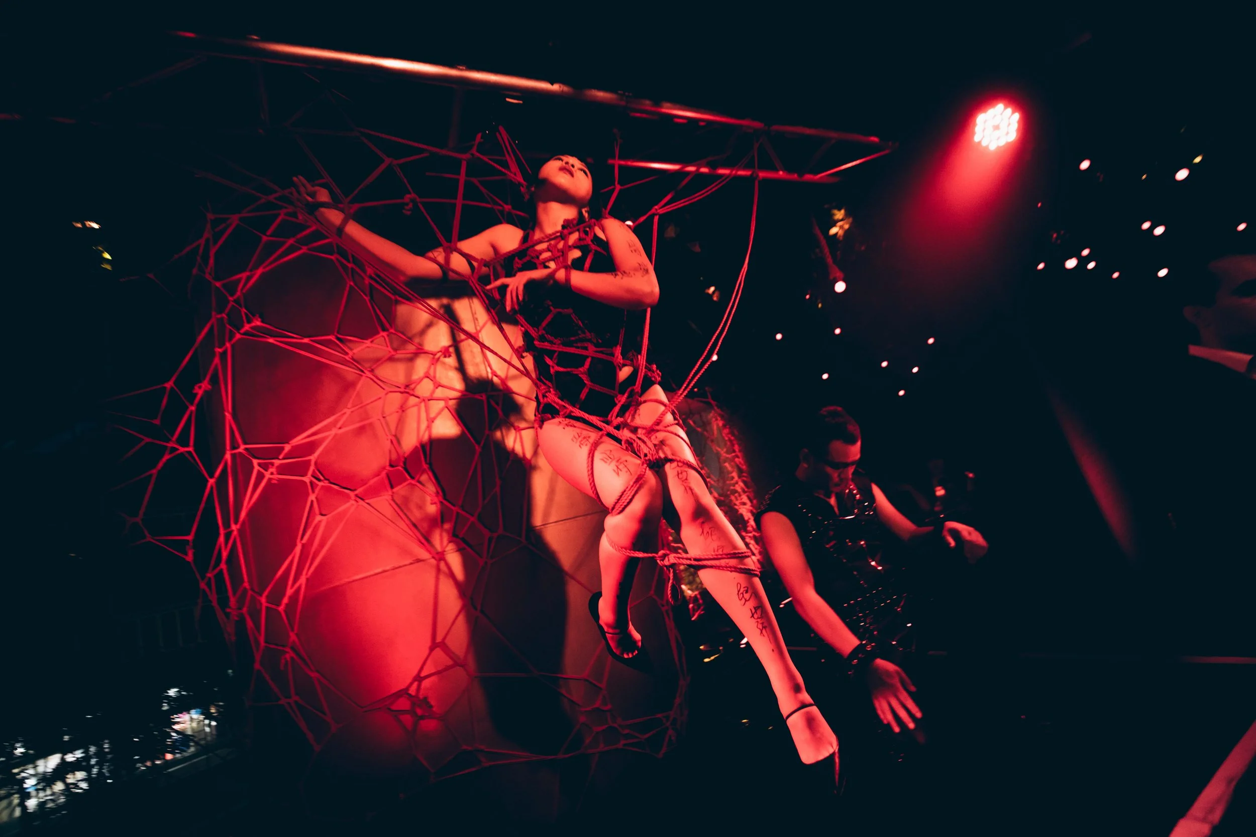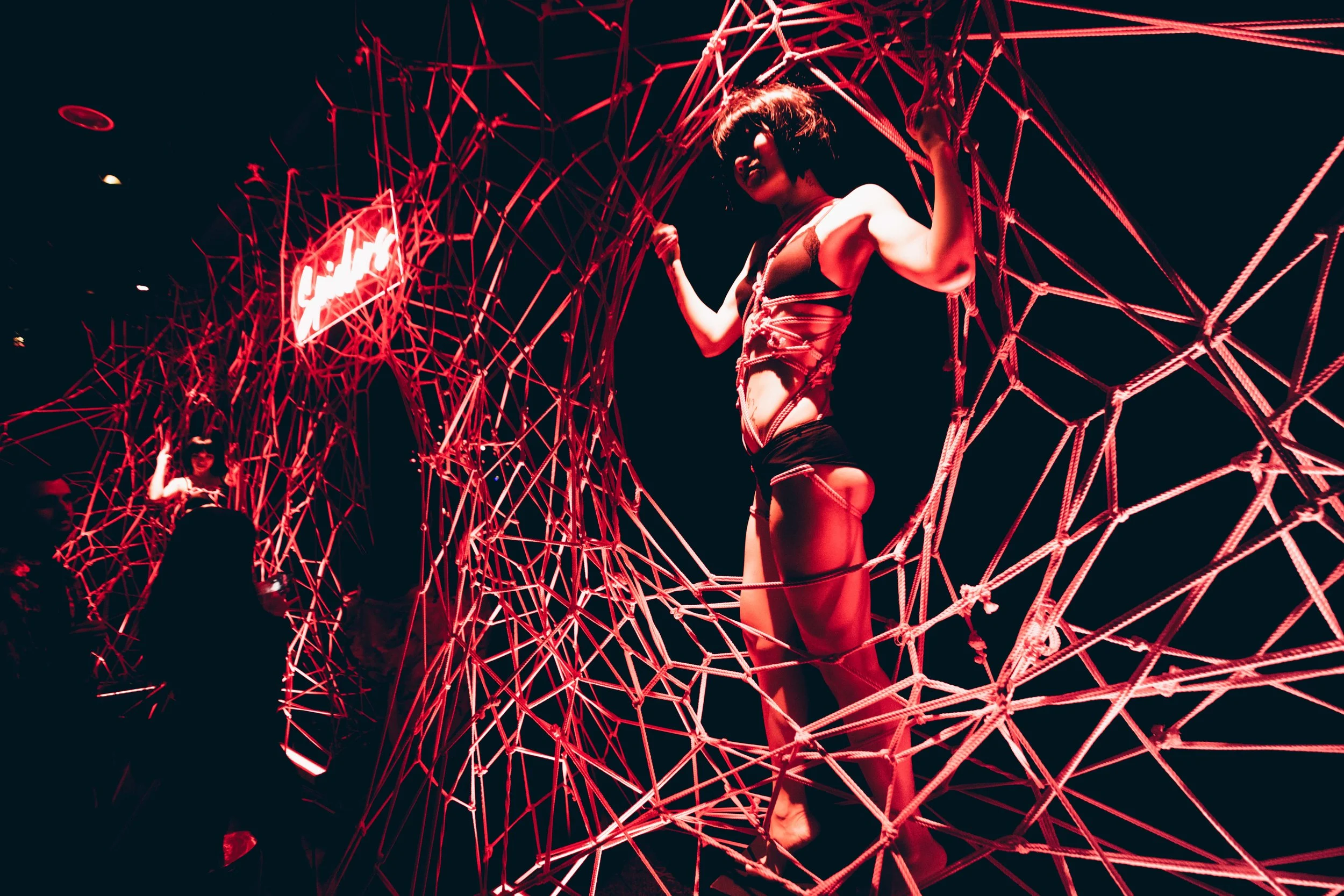 The highly anticipated event invited guests to lose themselves in a nest filled with dangerously beautiful creatures. A large-scale rope installation, which took one week to create, greeted partygoers who dressed to the theme of “Scary Black Elegance meets Savage Red Beauties”. Two performances by Rope & Shibari artist Kinoko Hajime injected the night with erotic artistry. Immersive dance and character performances sprung up spontaneously through the crowd. The Australian DJ duo, Nervo, was the headline act playing a banging set of EDM, Electro House and Progressive House.