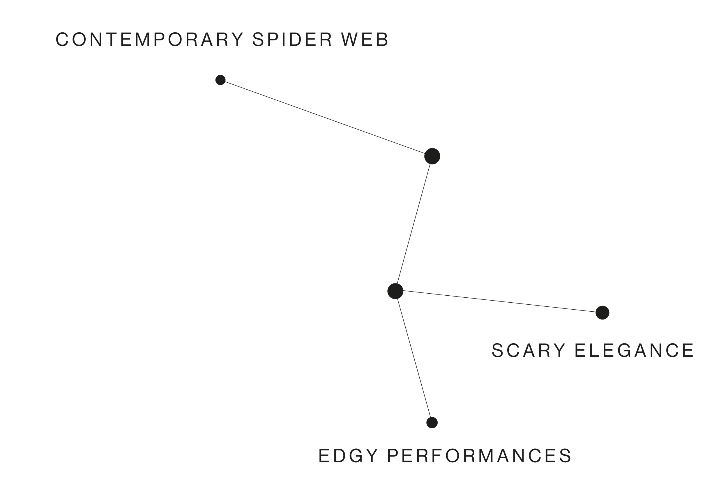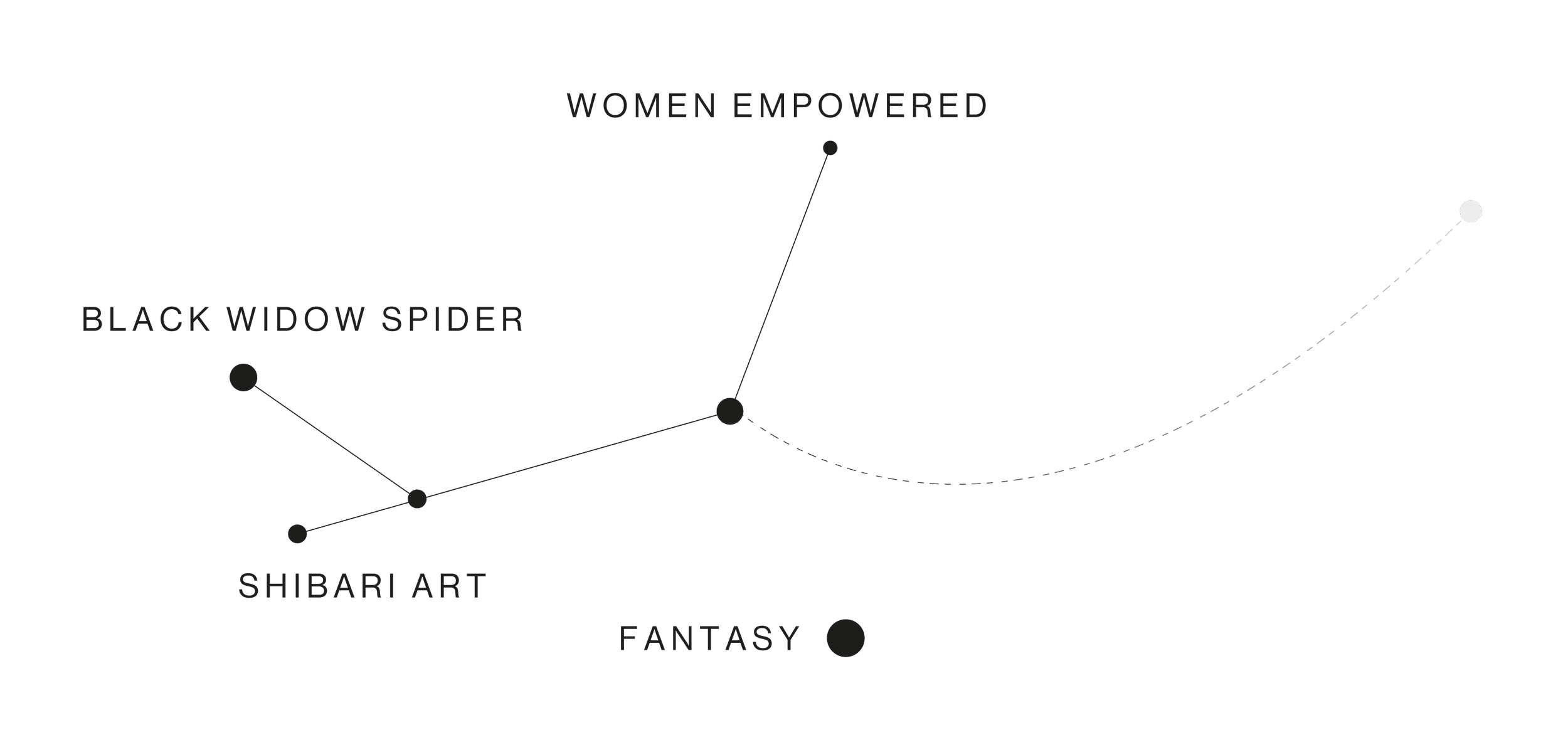 With a desire to avoid common Halloween themes while still evoking darkness and danger, Hugo Belloy found inspiration from the Japanese rope-tying art, Shibari. A connection was drawn between the intricate patterns of the carefully crafted knots and the nature of a Black Widow. This spider is known for its deadly venom and the tendency for females to eat their mates after sexual relations.